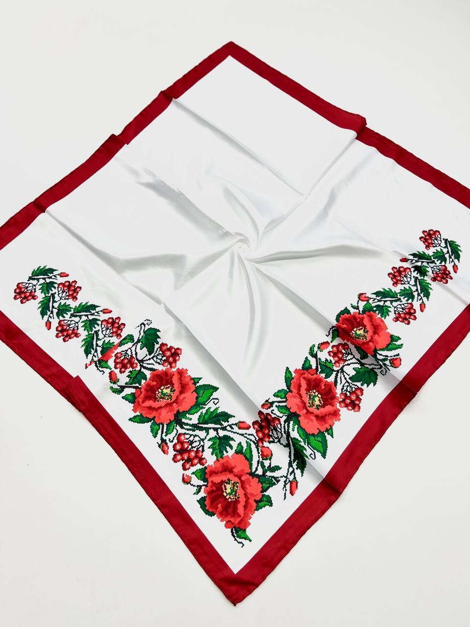 Патріотична шовкова хустка Вишиванка квіти 90*90 см біла ручна обробка краю